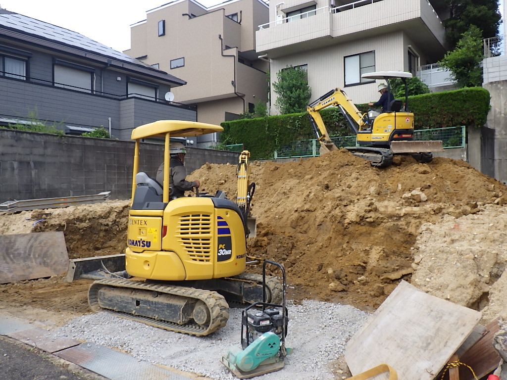 敷地が前面道路より高かったため、掘削工事を行い、ブロックで土留めを施工して駐車場部分の高さを下げ、道路とフラットに仕上げました。